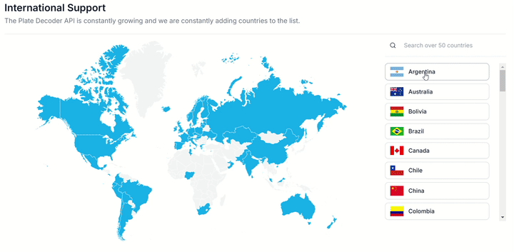 Unlock international support with Plate Decoder 2.0—now available in over 50 countries! This enhanced version makes it easier than ever to retrieve vehicle details from license plates worldwide. Plus, with our new interactive map, you can quickly check coverage areas and explore global reach in real time. Experience the power of international plate decoding today. View Plate Decoder V2.
