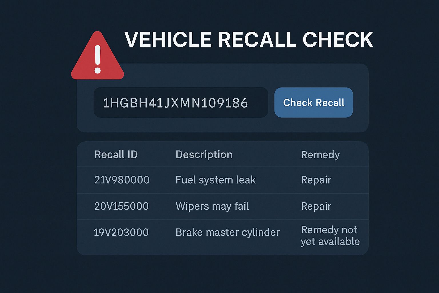 Pull active and historical recall information by VIN, make, or model, and get details like NHTSA campaign numbers, affected components, and remedy status—all in real time.